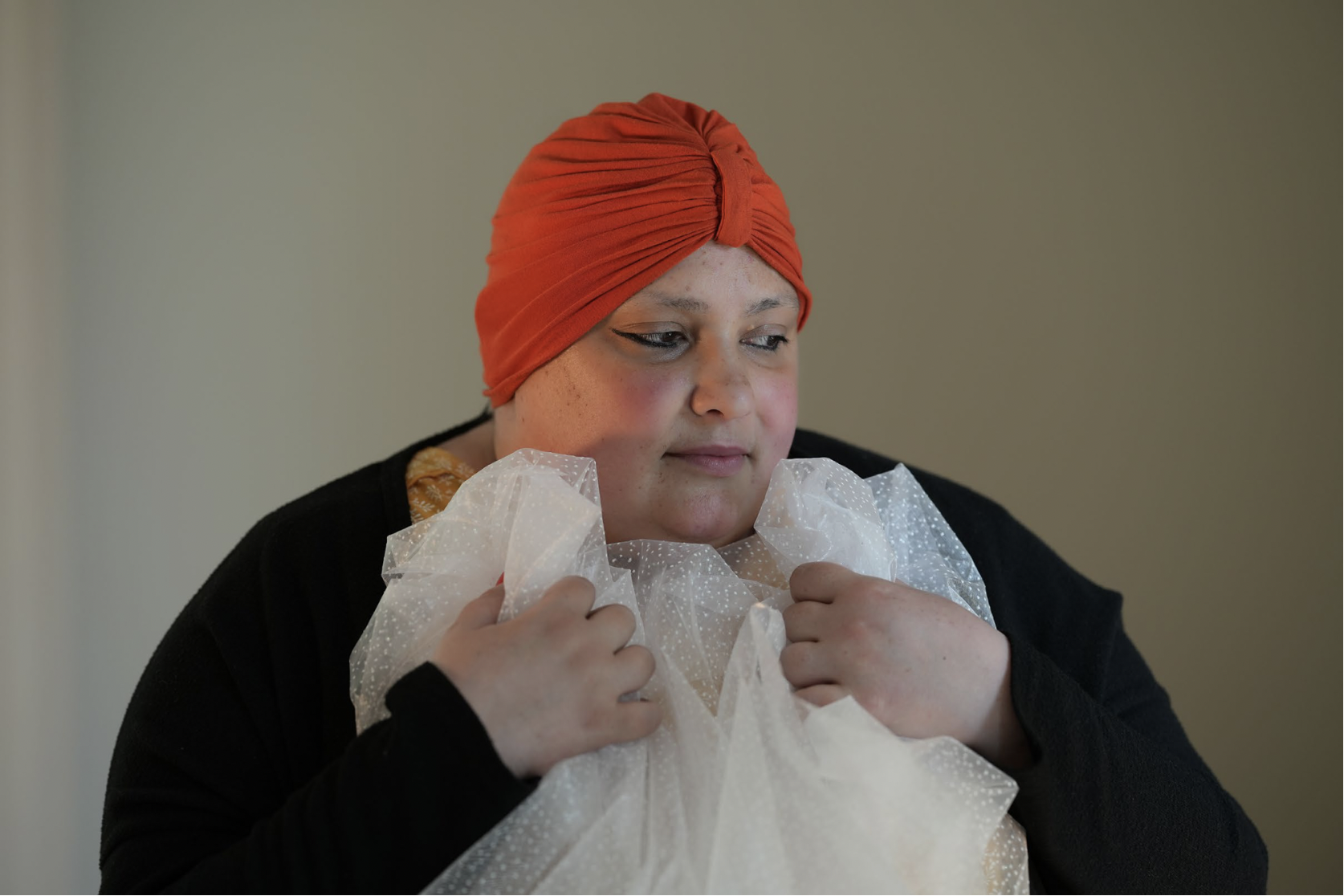 Le dispositif repose sur deux rencontres avec des personnes volontaires. Je ne sais rien d’elles ou presque, seulement leurs noms. Un studio est installé dans un espace spacieux. À la première rencontre, un lien se crée, la personne aborde ce qu’elle veut. Le mot «subir» revient souvent. Je leur propose une scène où elles vont pouvoir se voir autrement, en devenant actrices de leurs photographies. L’idée est celle-là : fabriquer des photos ensemble, croiser nos imaginaires. Je leur demande pour la deuxième rencontre d’amener quelque chose qui est important pour elles.