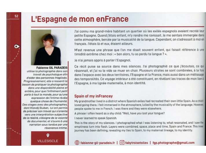 Un fil conducteur se dessine avec des thèmes qui articulent sa démarche, la mémoire, l’absence, la transmission générationnelle, l’exil, la fragilité psychique, les impensés … L’Espagne de mon enf(r)ance éclaire les failles telles des sources de création, elles permettent de visiter le passé, de le faire vivre dans le présent, de transformer la perception que nous avons de nous mêmes, de notre histoire. En 2025, ce travail a été retenu pour trois festivals photographiques, ainsi qu’une publication dans la revue « Pourtant », Silence (numéro 10).